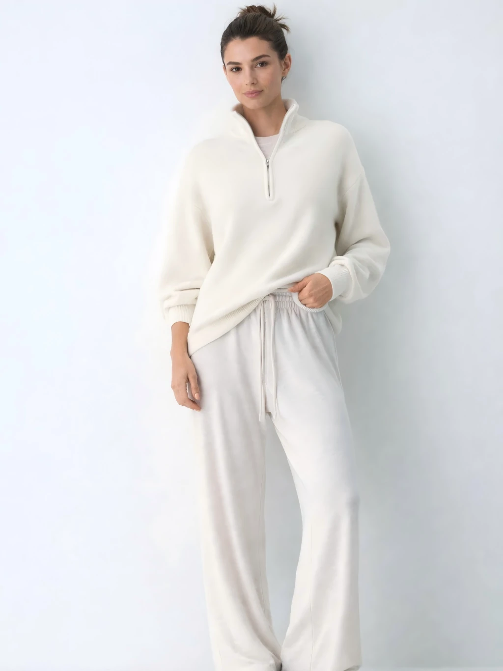 Loungewear styles made with soft knit or brushed fabrics, offering warmth and a cozy feel without appearing like sleepwear.