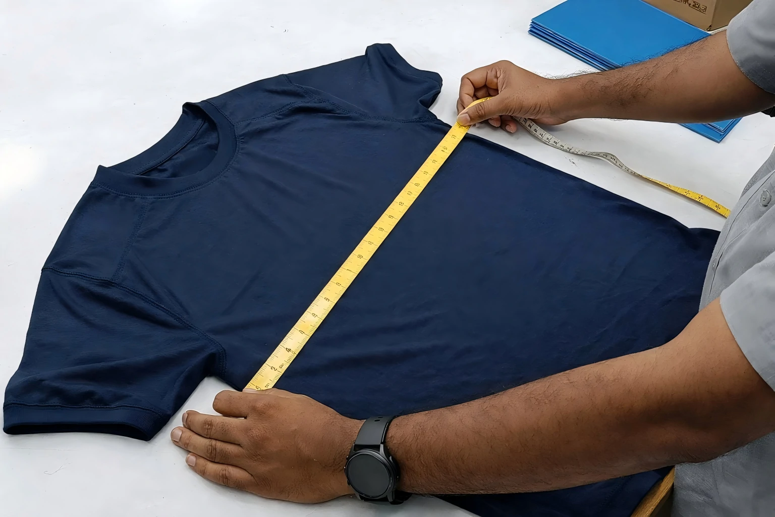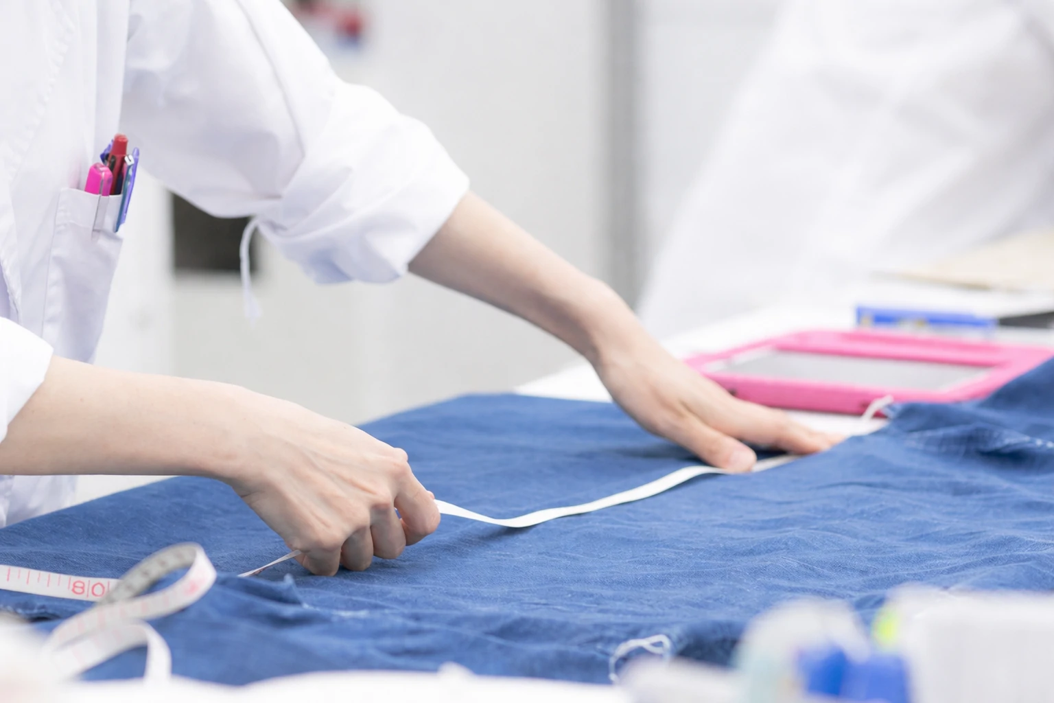 Fabric quality, weight, color, and surface condition are checked before production begins.